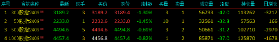 2024年9月9日,股指期货震荡下行,沪深300股指期货(IF)主力合约跌1.30%,上证50股指期货(IH)主力合约跌1.45%,中证500股指期货(IC)主力合约跌0.69%,中证1000股指期货(IM)主力合约跌0.82%。